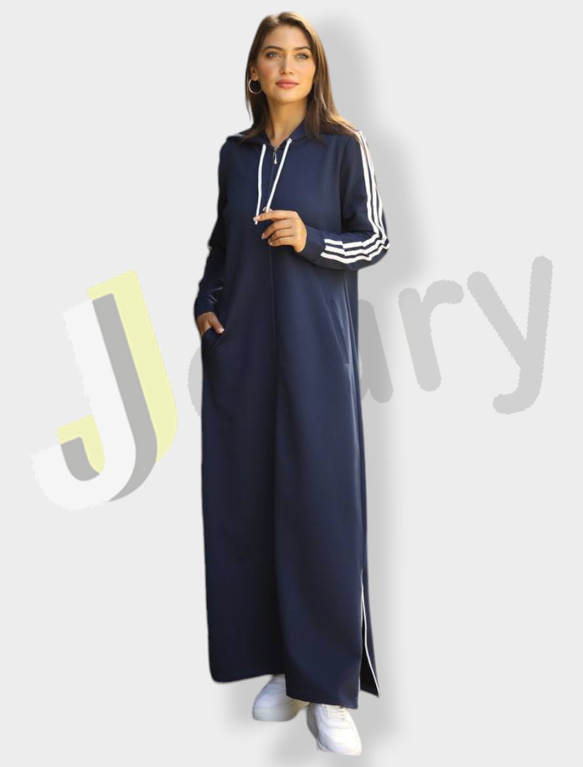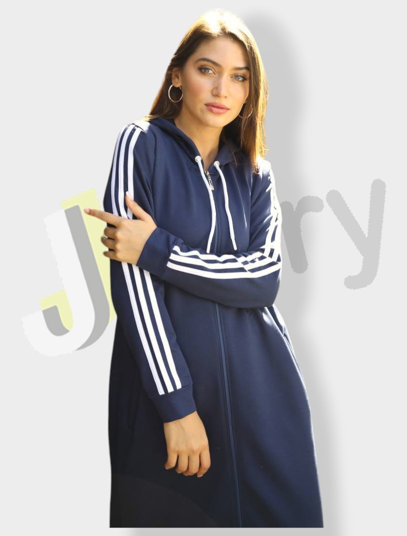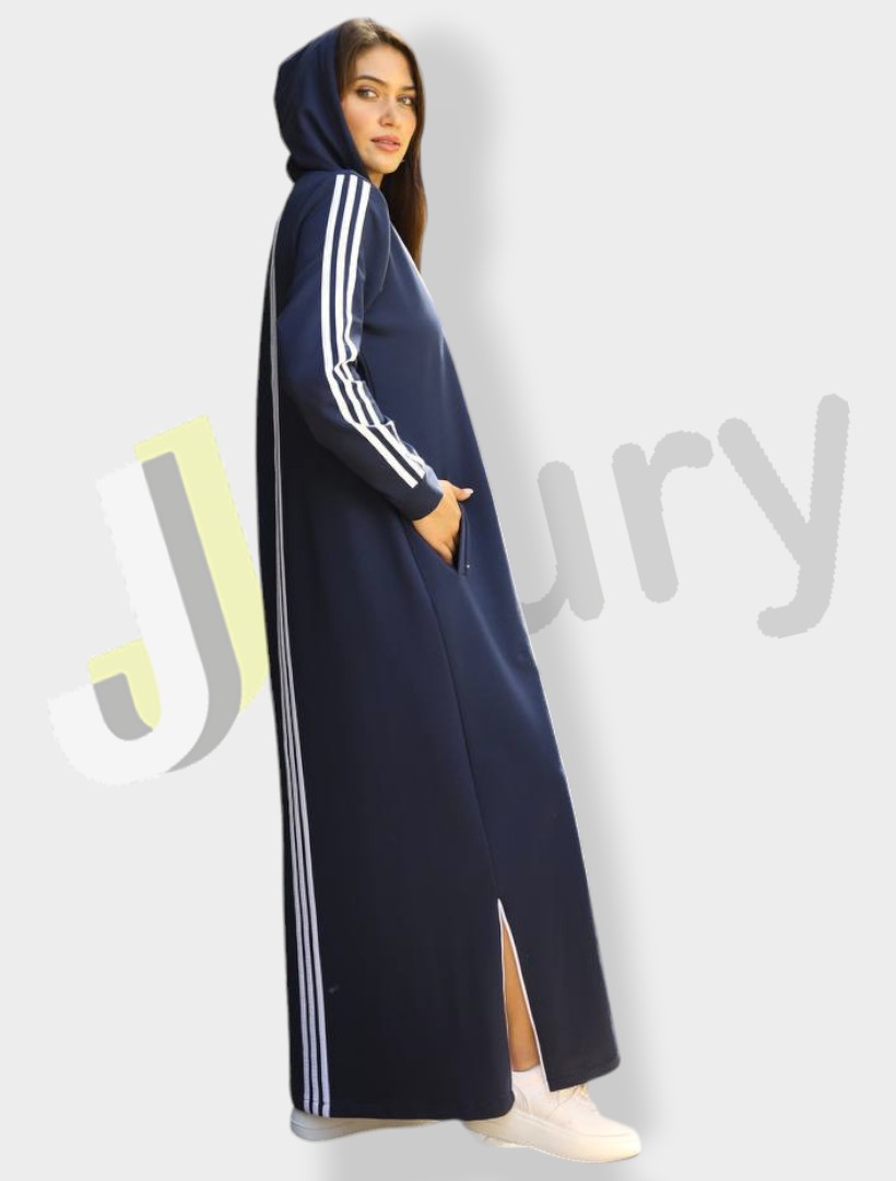 معطف نسائي طويل (140 سم) بسحاب من الأمام ومزين بخطوط طول من الخلف مع غطاء رأس برباط وجيوب على الجانبين بأكمام طويلة مزينة بخطوط طولية