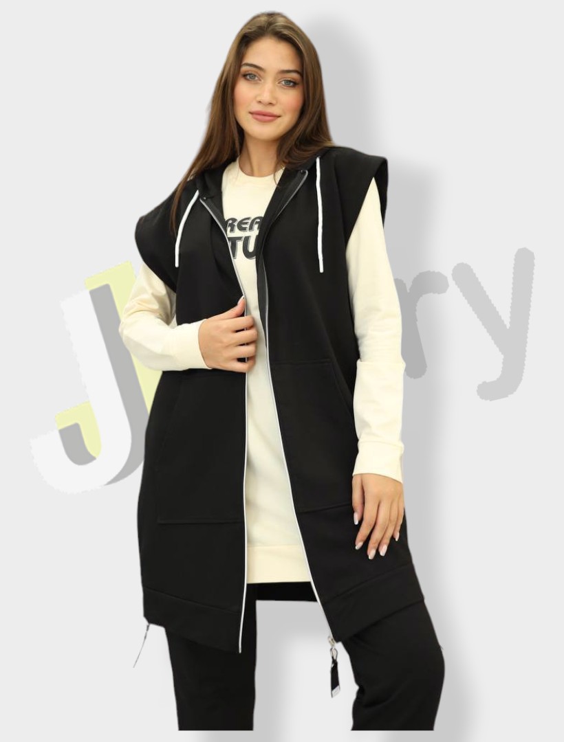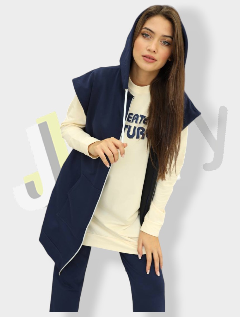 “Elegantes Damen-Set aus drei Teilen: ärmellose Midijacke (90 cm) mit Kapuze, mit Kordelzug und seitlichen Taschen, vorne und seitlich mit Reißverschluss, kombiniert mit einer Bluse, die der Länge der Jacke entspricht und mit Textdruck verziert ist, sowie eine elegante, einfarbige Hose.”