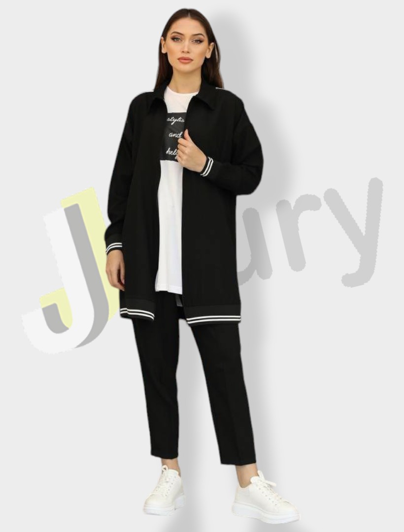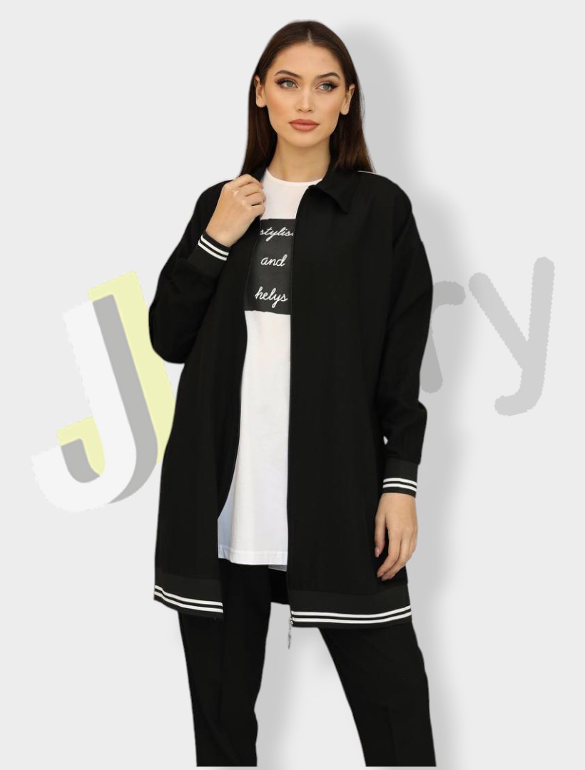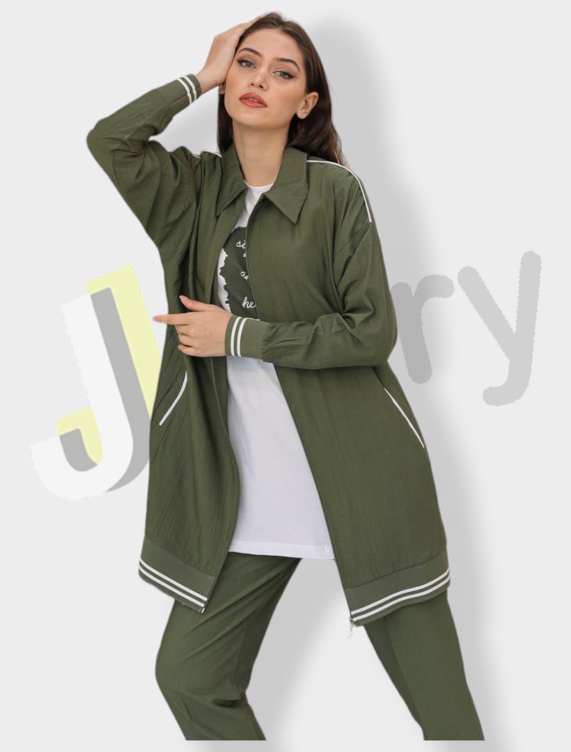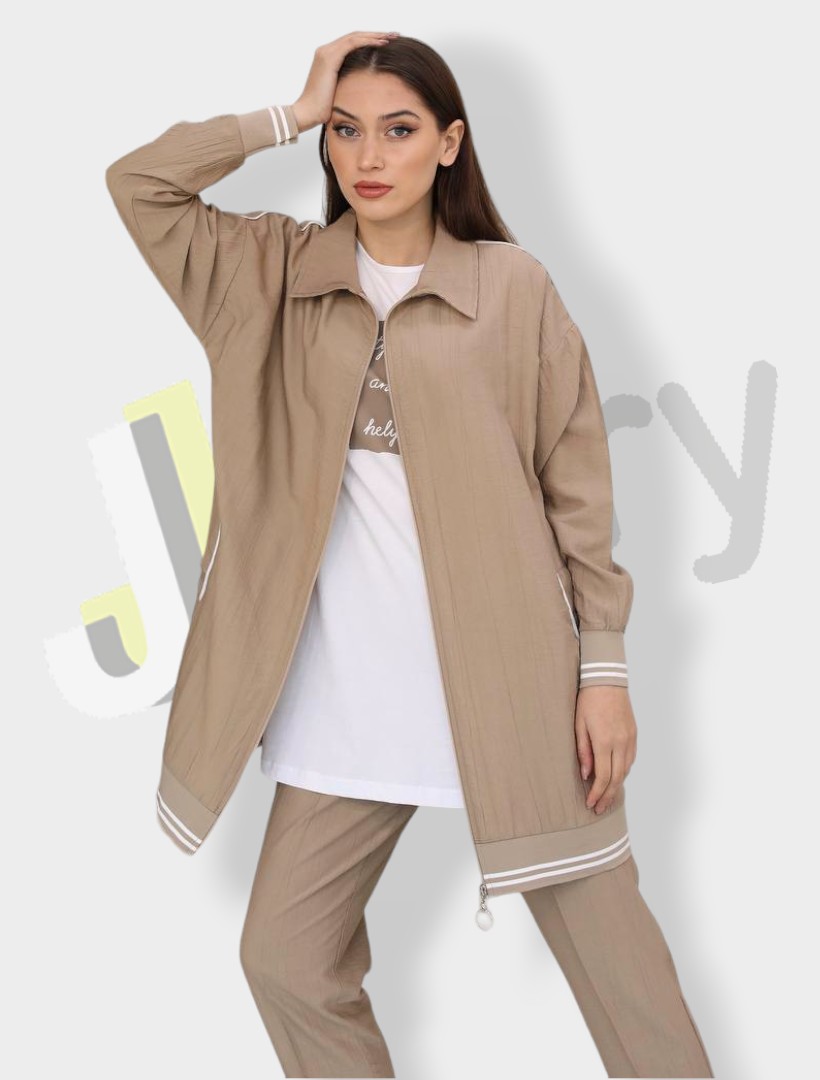 “Elegantes Damen-Set aus drei Teilen: eine Jacke (90 cm) mit eleganten Streifen am unteren Rand, Reißverschluss und seitlichen Taschen, kombiniert mit einer Bluse, die der Länge der Jacke entspricht und mit Textdruck verziert ist, sowie eine elegante, einfarbige Hose.”