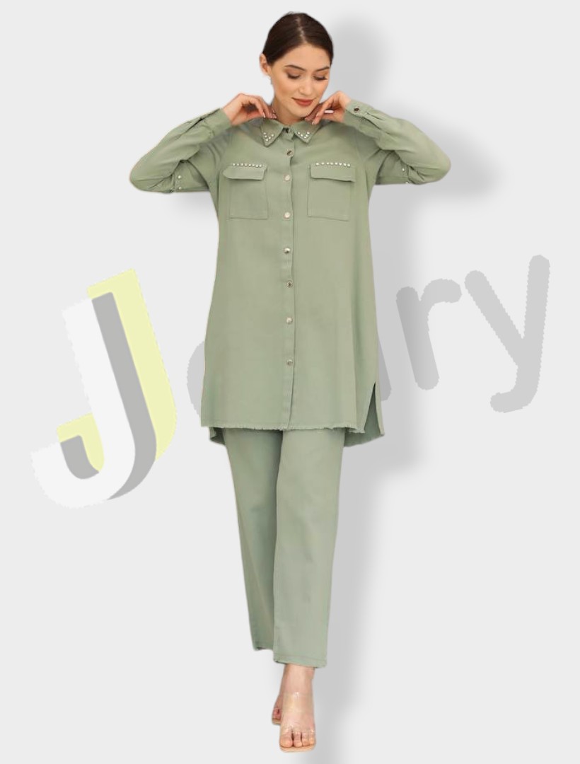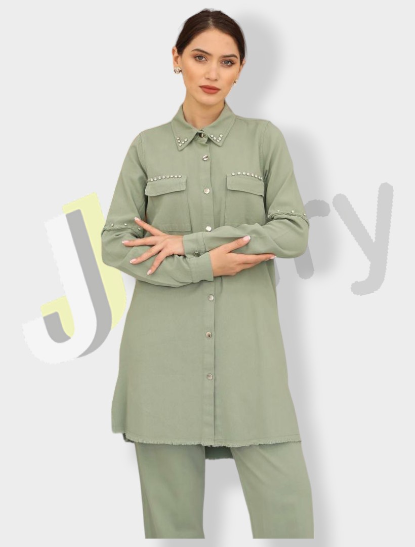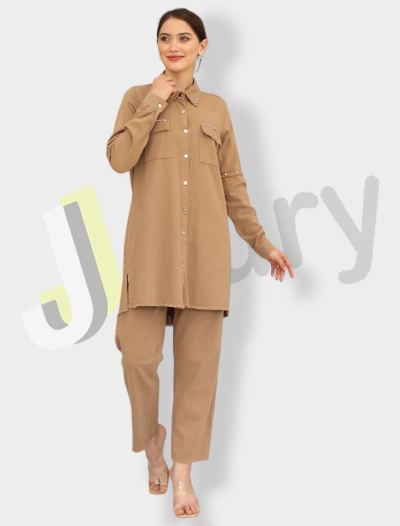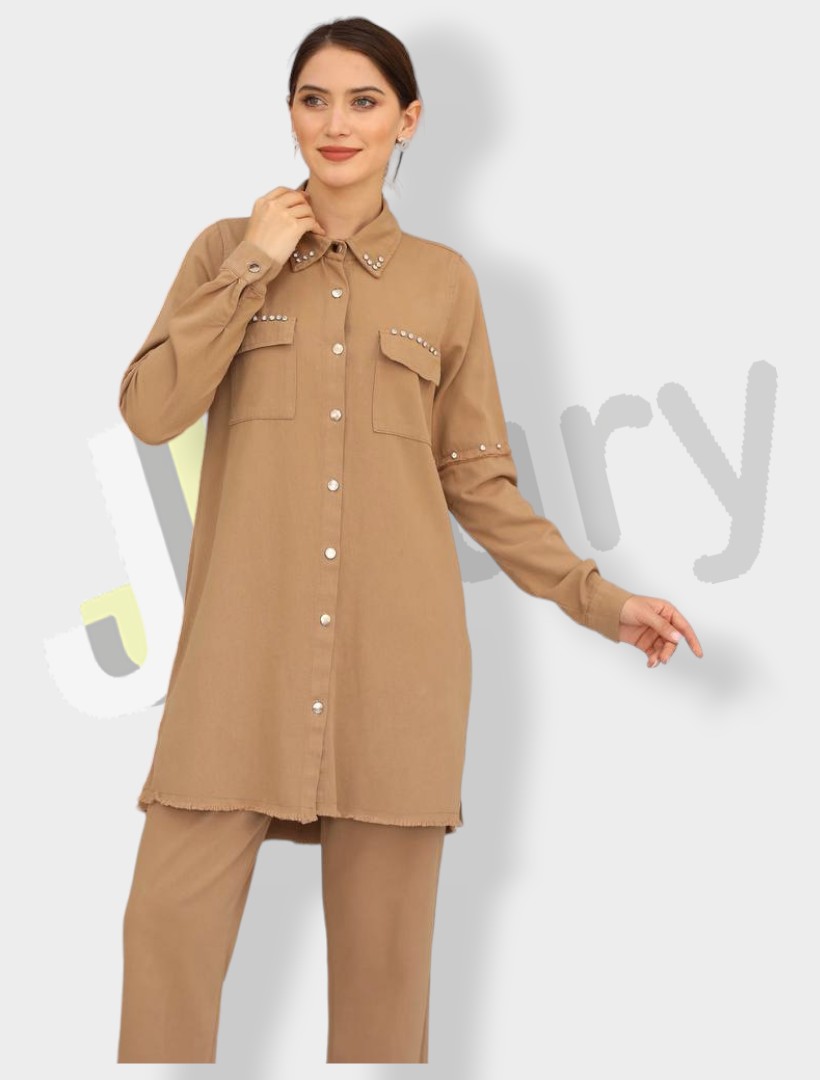 „Zweiteiliges Damen-Denim-Set: Hemd (90 cm) mit Kragen und Kristallverzierungen an den Ärmeln sowie oberen Taschen, kombiniert mit einer eleganten, einfarbigen Hose.“