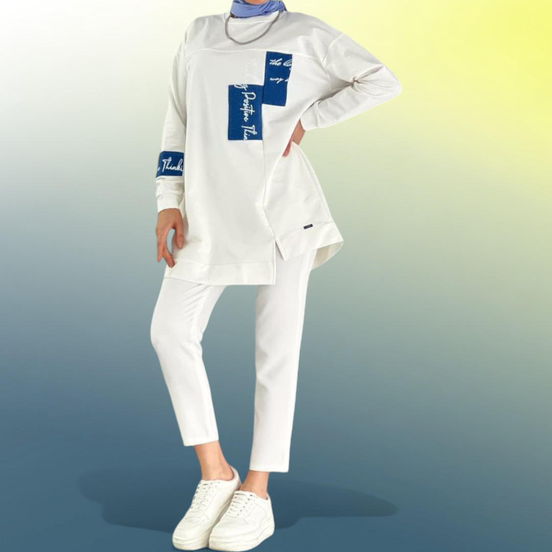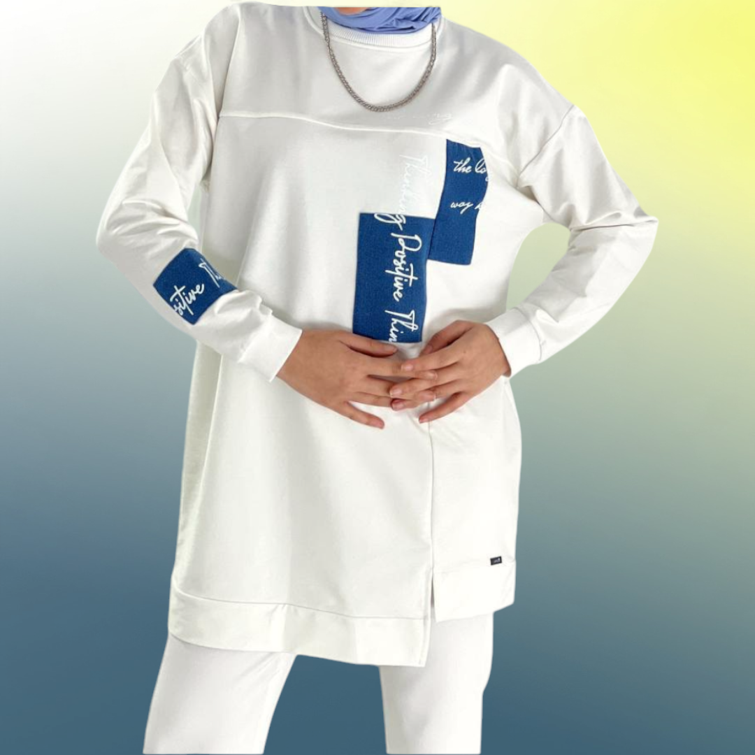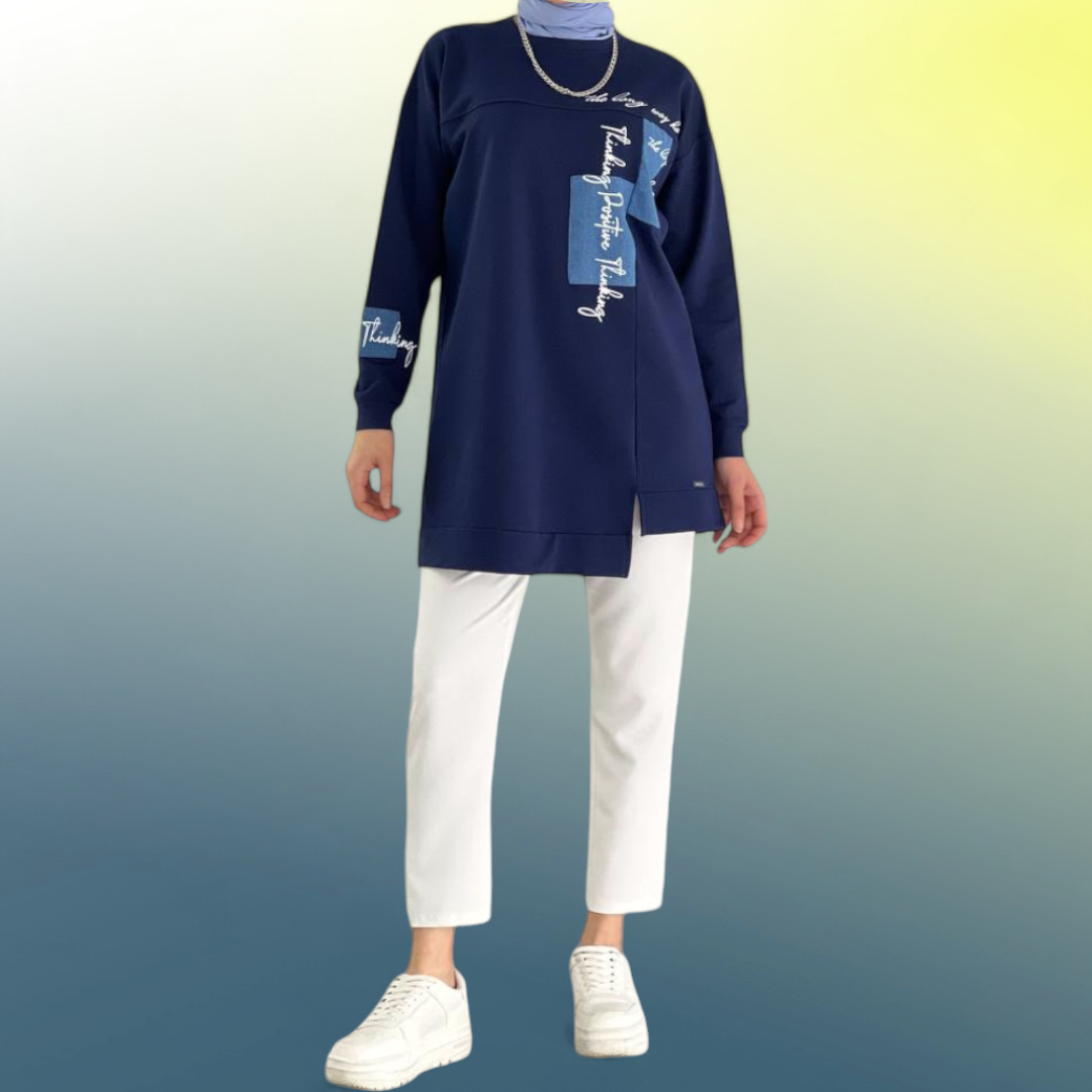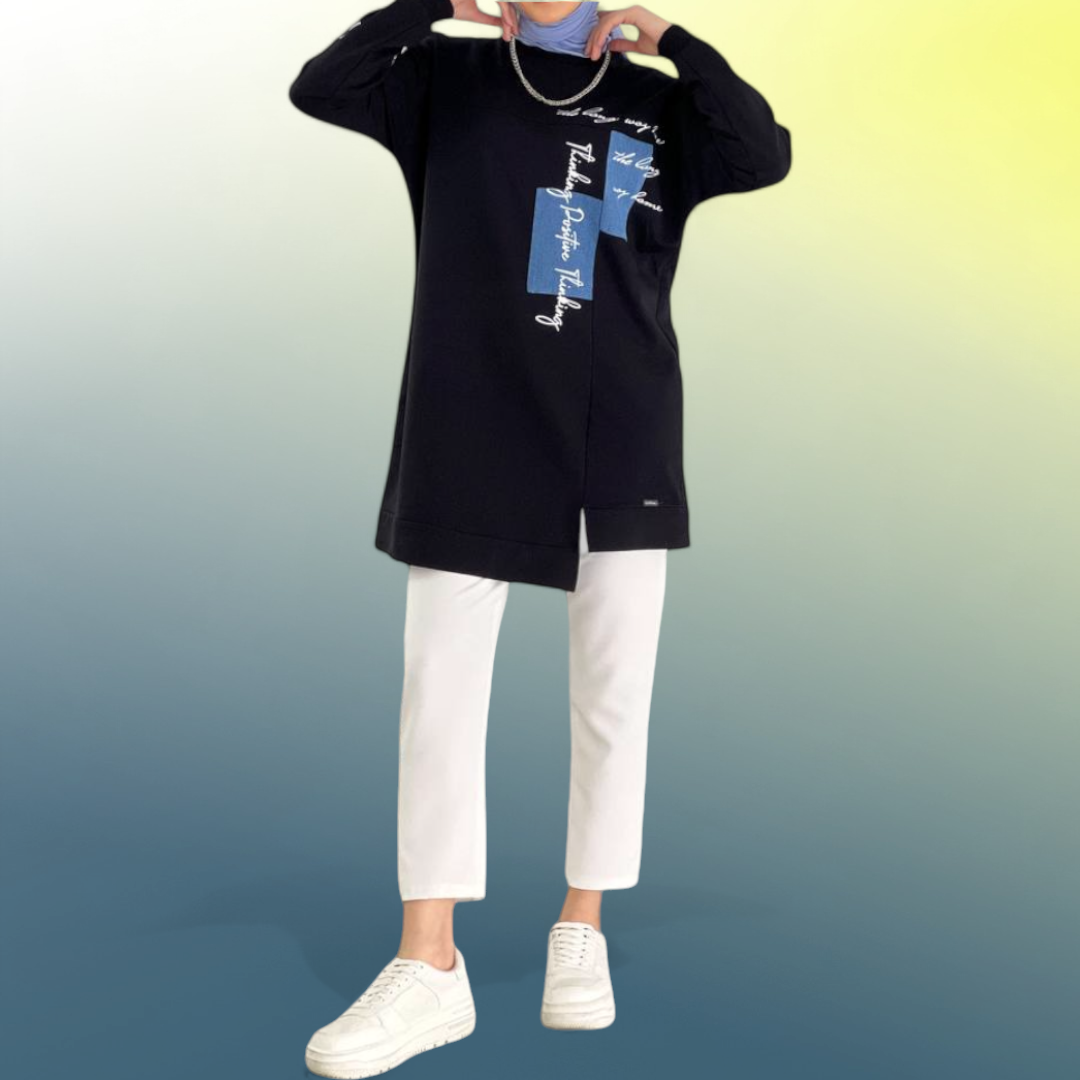 Lange Ärmel sind in Kontrastfarbe mit Text verziert