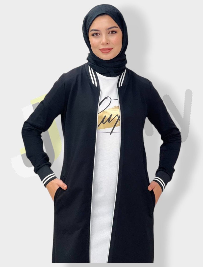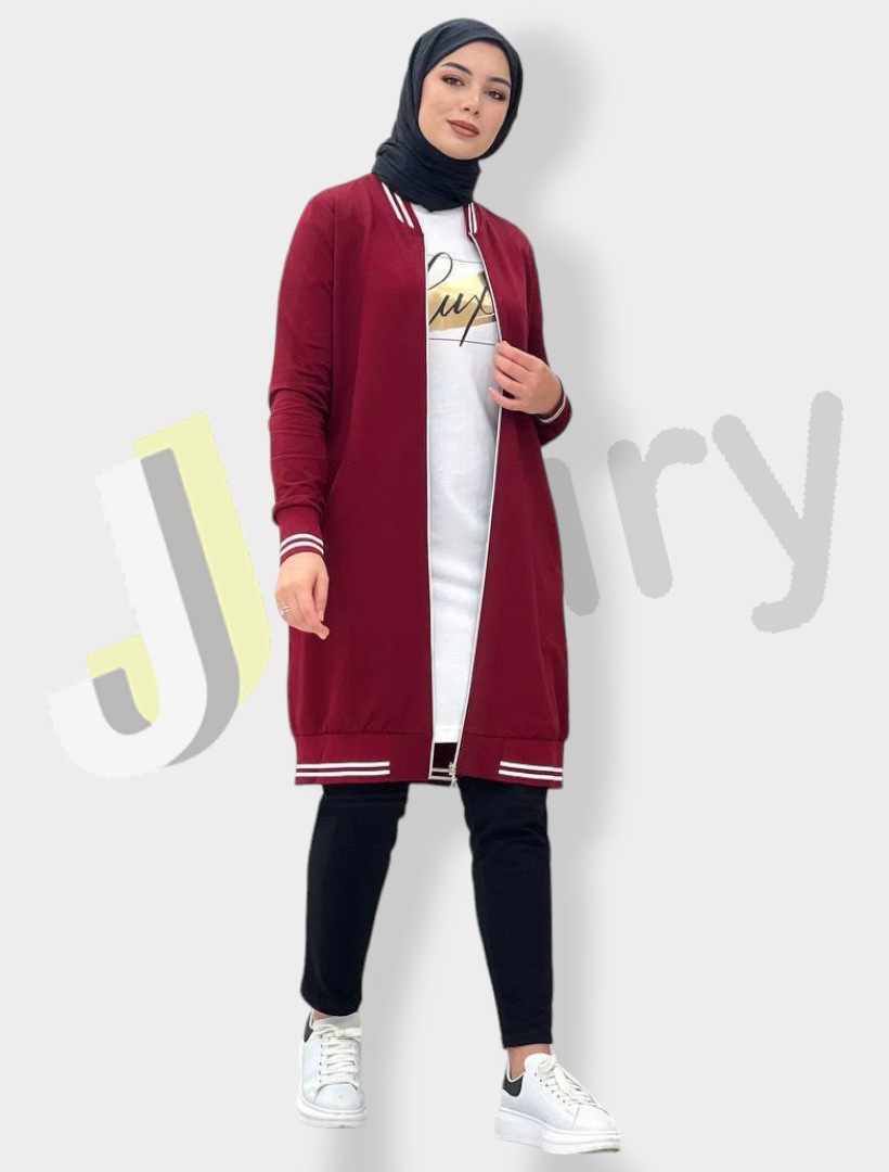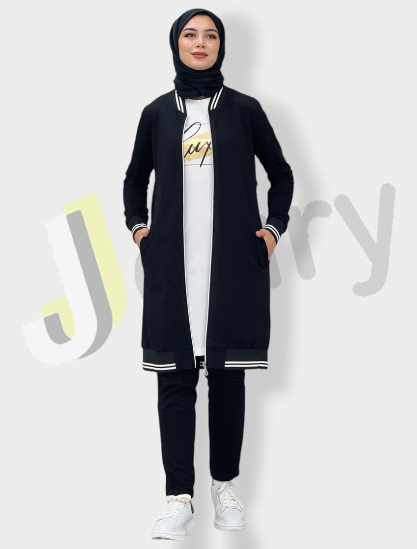 “Elegantes Damen-Baumwoll-Pyjama-Set aus drei Teilen: Midijacke (90 cm) mit eleganten Streifen am unteren Rand, Reißverschluss und seitlichen Taschen, kombiniert mit einer Bluse, die der Länge der Jacke entspricht und mit Textdruck verziert ist, sowie einer eleganten, einfarbigen Hose.”