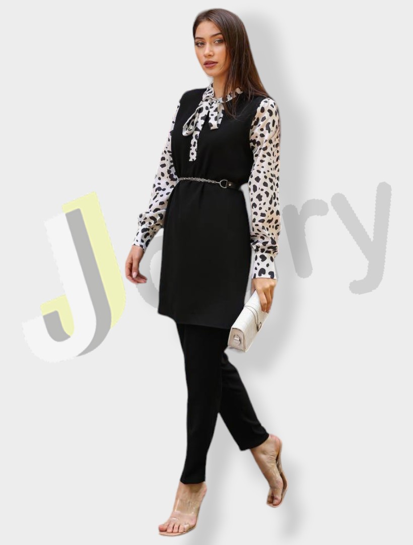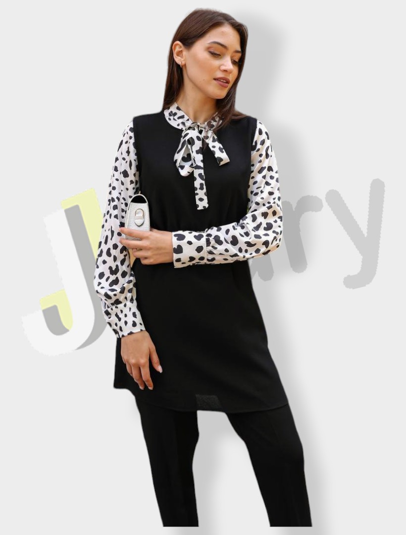 +Versandkosten“Elegantes Damen-Krepp-Set aus drei Teilen: eine schlichte, elegante Weste (90 cm) mit einem Gürtel in der Taille, kombiniert mit einer Bluse mit Bindekragen und Fleckenprint sowie einer eleganten, einfarbigen Hose.”