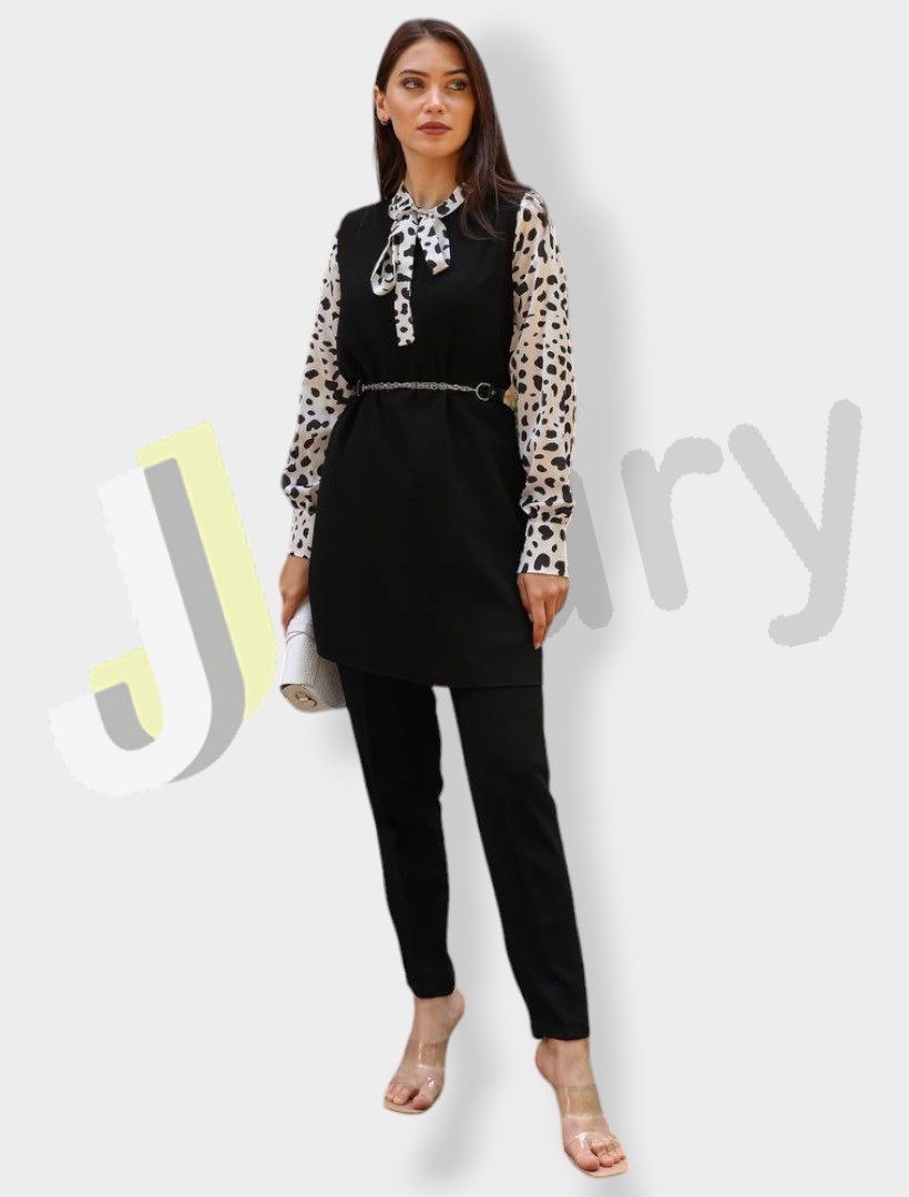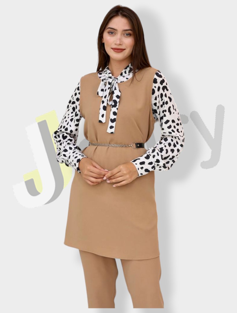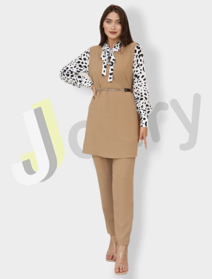 “Elegantes Damen-Krepp-Set aus drei Teilen: eine schlichte, elegante Weste (90 cm) mit einem Gürtel in der Taille, kombiniert mit einer Bluse mit Bindekragen und Fleckenprint sowie einer eleganten, einfarbigen Hose.”