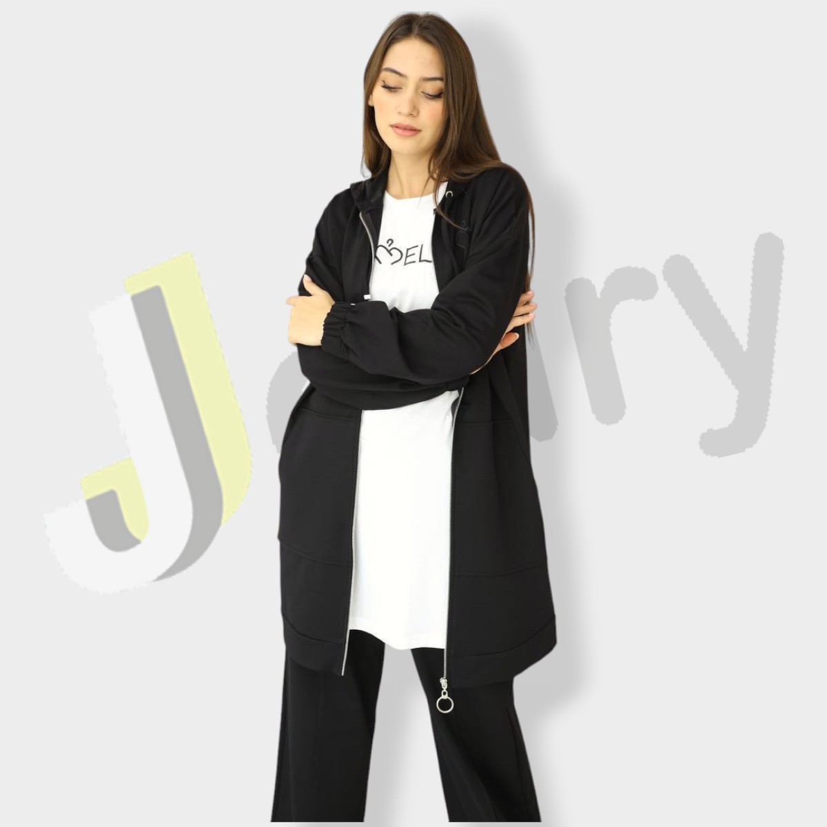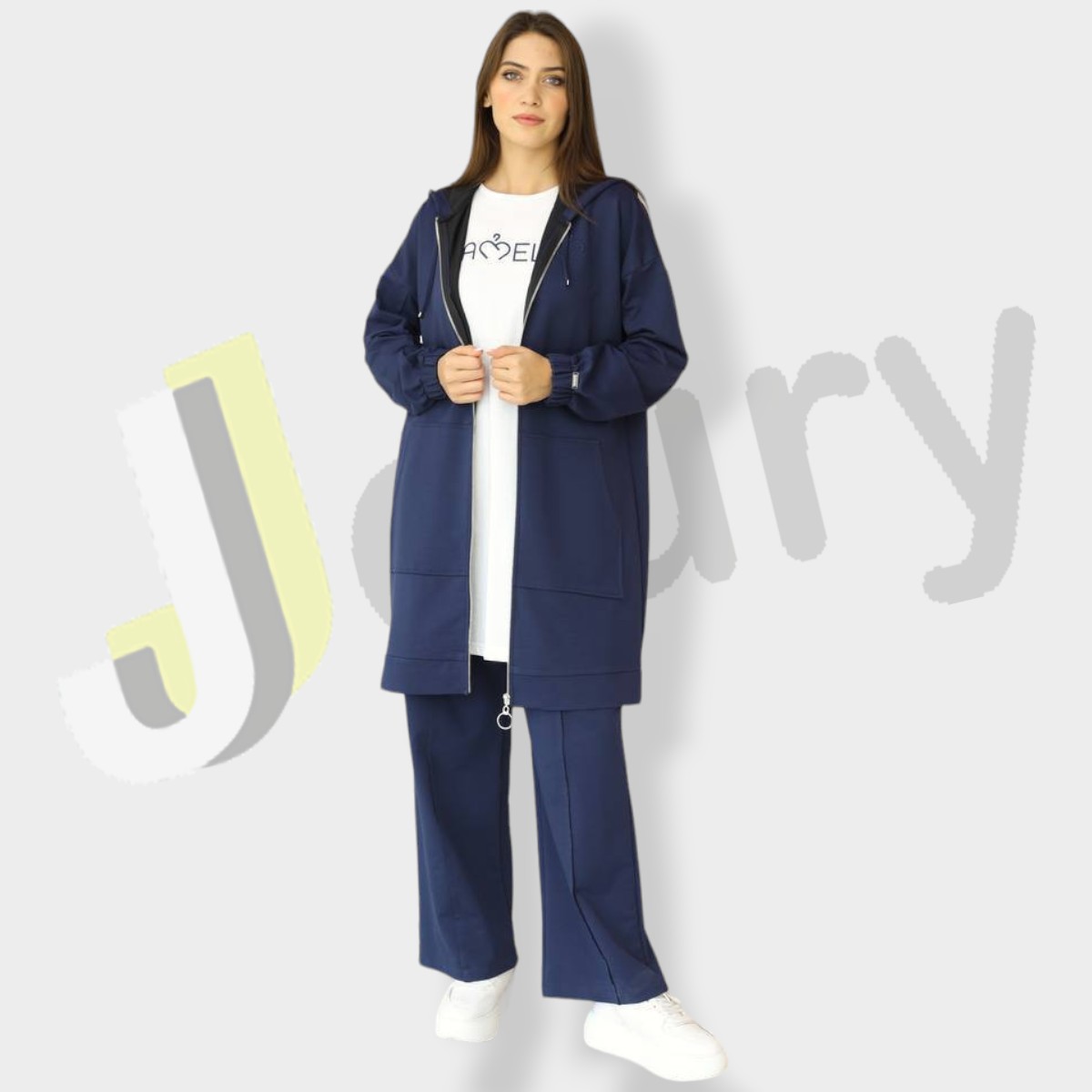 “Elegantes Damen-Set aus hochwertiger türkischer Baumwolle, bestehend aus drei Teilen: Jacke (90 cm) mit langen, elastischen Ärmeln, Reißverschluss, seitlichen Taschen und einer Kapuze mit Kordelzug, kombiniert mit einer inneren Bluse, die mit Textdruck verziert ist, und einer weit geschnittenen Hose.”