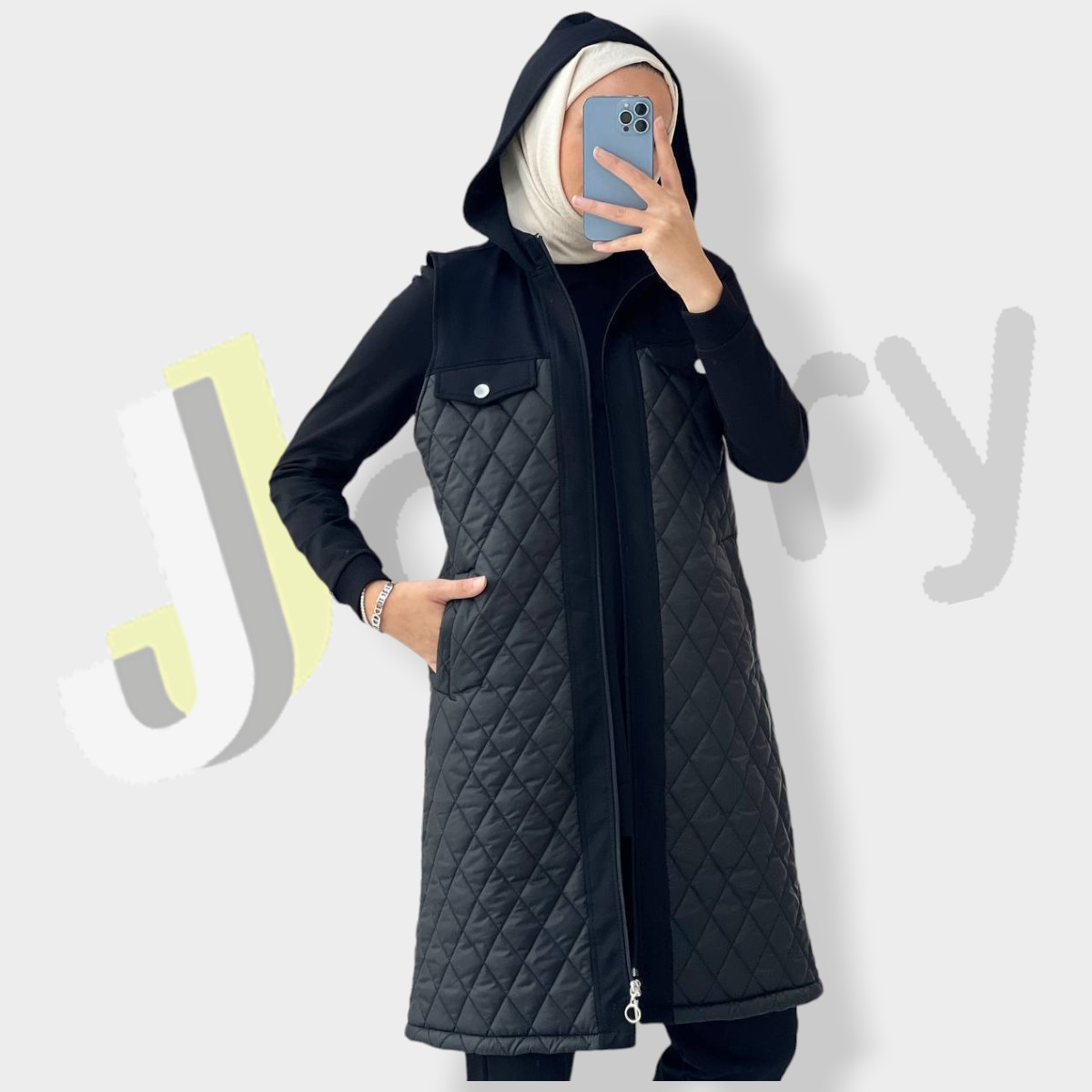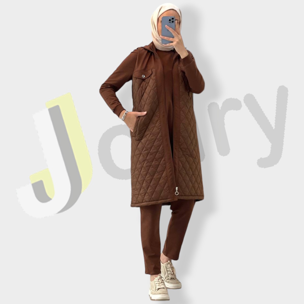 “Winterliches Damen-Set aus drei Teilen, dick und warm: Wattierte Jacke des Typs 1 (100 cm) ohne Ärmel, mit Kapuze und Kordelzug sowie Reißverschluss, kombiniert mit einer einfarbigen Bluse und einer eleganten Hose aus hochwertiger türkischer Baumwolle.”