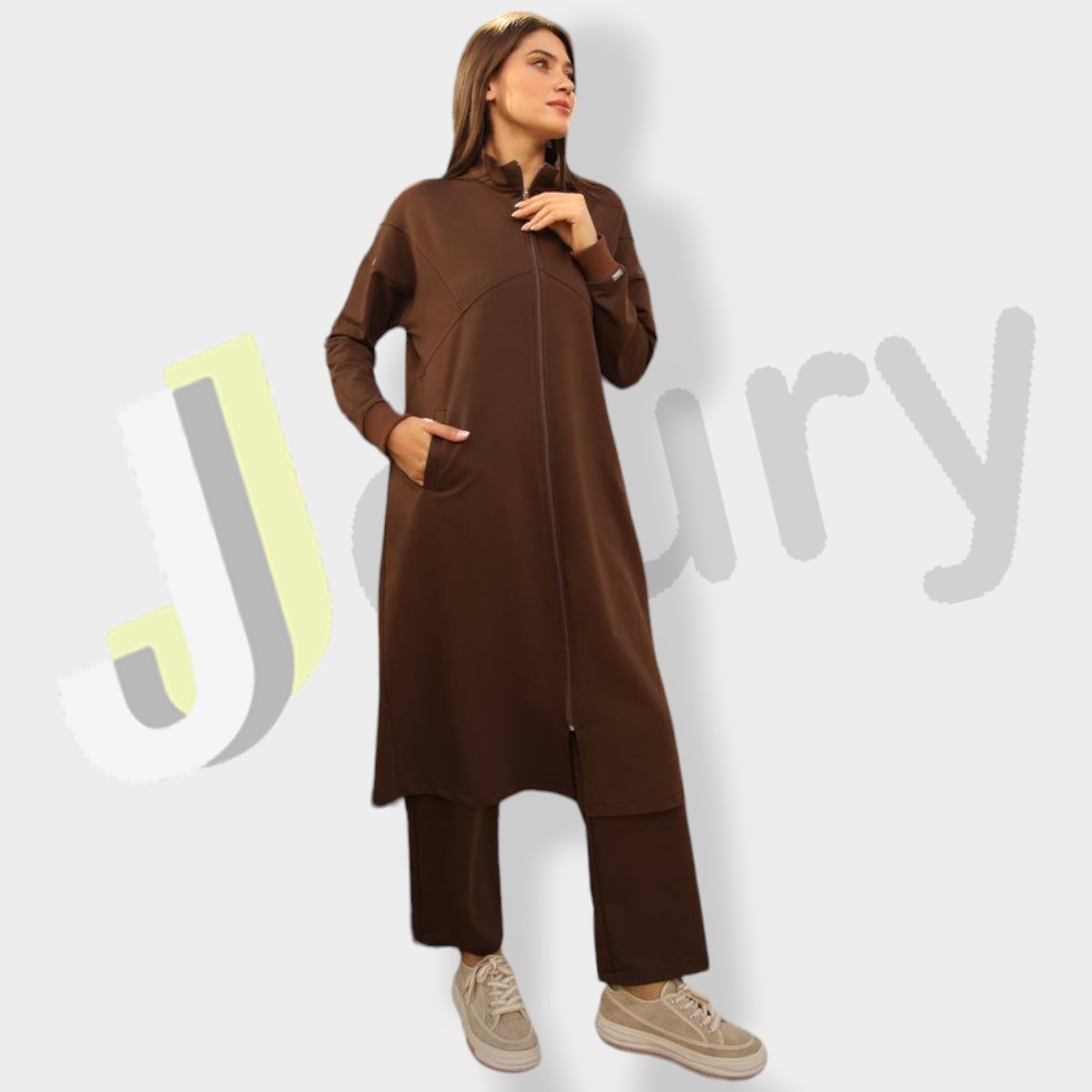 “Elegantes Damen-Set aus hochwertiger türkischer Baumwolle, bestehend aus zwei Teilen: Midijacke (110 cm) mit Reißverschluss, seitlichen Taschen und Cape-Kragen sowie einer eleganten, einfarbigen Hose.”